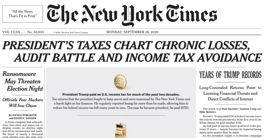 “È una delle più importanti storie degli ultimi 5 anni, non solo di quest’anno”. Così Brian Stelter della CNN ha commentato lo scoop pubblicato lunedì 28 settembre dal New York Times sulle dichiarazione dei redditi del presidente degli Stati Uniti d’America, Donald Trump, delle società di proprietà della Trump Organization risalenti agli anni '90, così come quelle personali del 2016 e 2017. Documenti che per anni Trump ha cercato di tenere segreti e che si è rifiutato di rendere pubblici, interrompendo una lunga tradizione che dagli anni ‘70 vede i presidenti americani pubblicare le loro dichiarazioni dei redditi. Il New York Times è riuscito ad ottenerli mettendo a segno uno scoop di rilevanza storica. I documenti delle tasse di Trump smascherano l’ipocrisia e le bugie di un presidente che per anni ha venduto ai cittadini americani e al mondo l’immagine di un multi-miliardario che si è fatto da solo, di un uomo d’affari di grande successo. La storia che emerge dallo scoop è quella di un debitore seriale, di un imprenditore mediocre e dedito sistematicamente all’elusione fiscale.